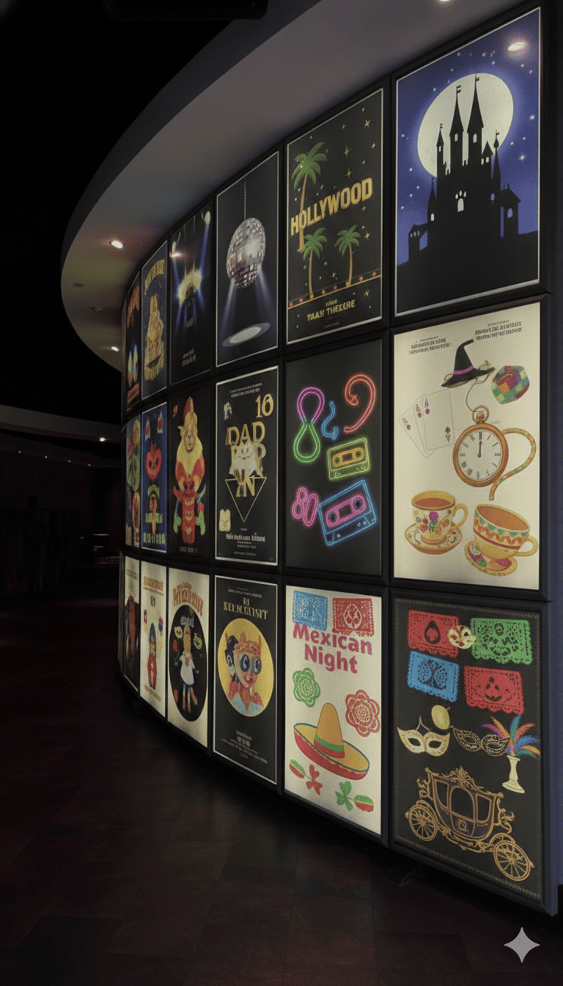 es una forma de elevar eventos privados y celebraciones con pantallas LED, visuales temáticos y sonido profesional para crear una experiencia inmersiva tipo cine, adaptada al estilo y mood de cada evento.